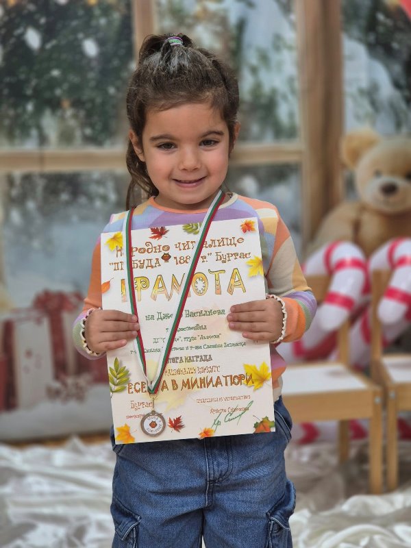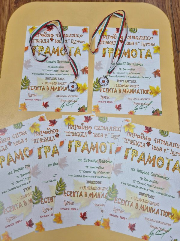 Децата от група "Лъвчета" участваха в Националния конкурс „Есента в миниатюри“, организиран от НЧ „Пробуда 1880 г.“Темата на конкурса бе ЕСЕНЕН БУКЕТ Задачата е участниците да създадат миниатюрно произведение - рисунка или графика, което да побере цялата красота и настроение на есента в съвсем малък формат.