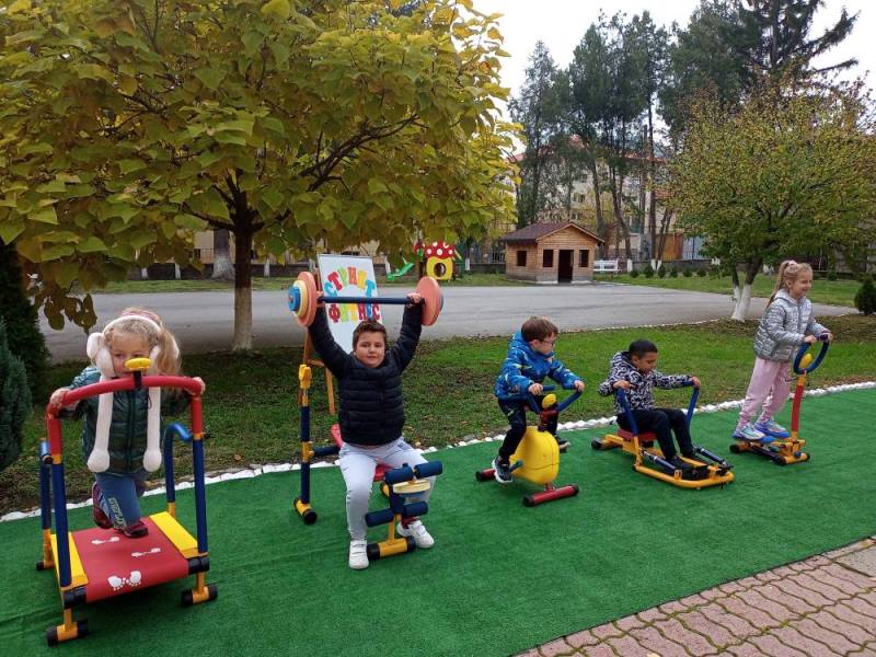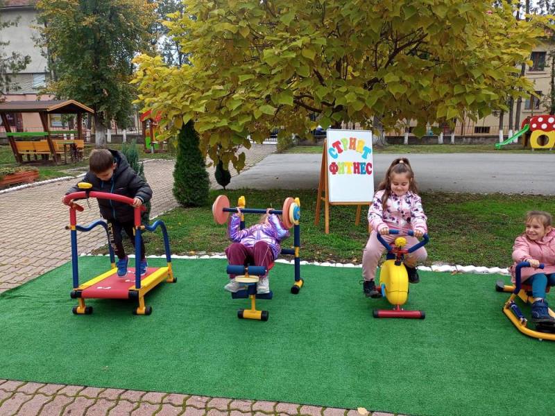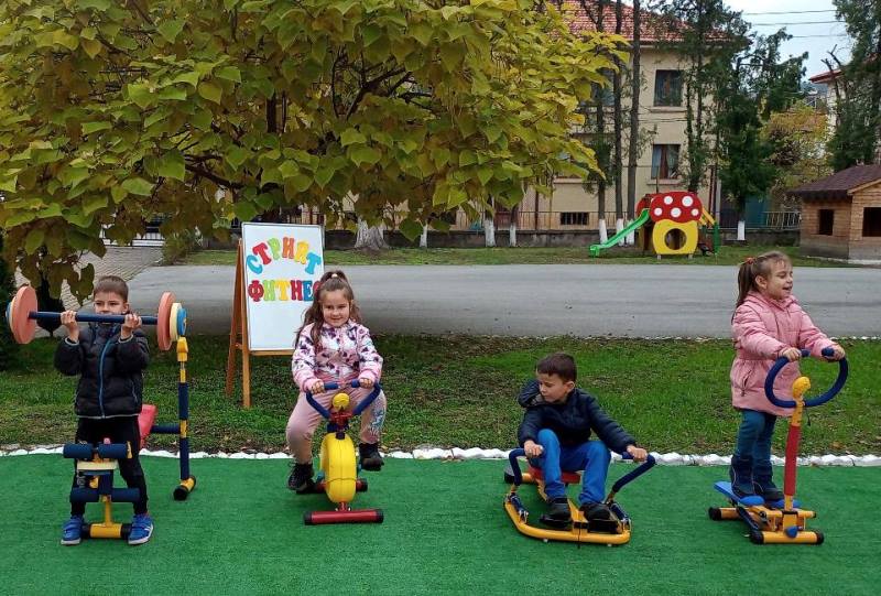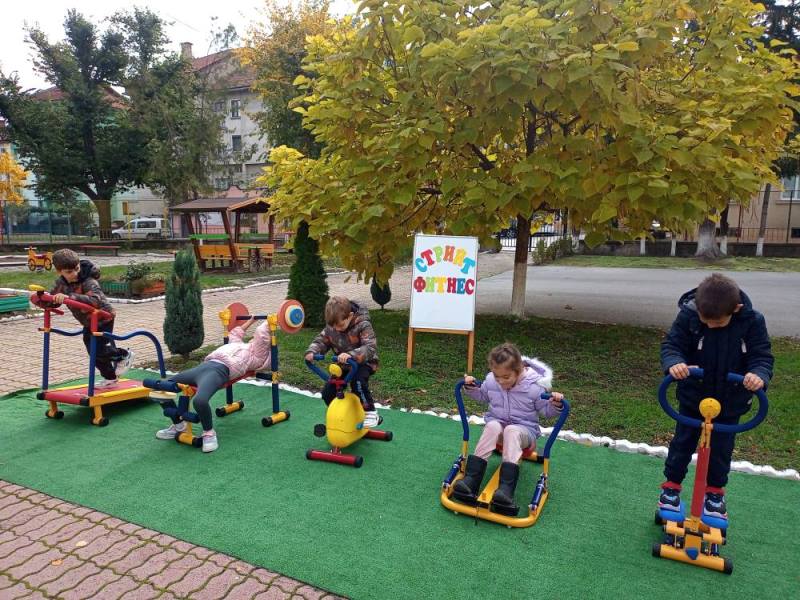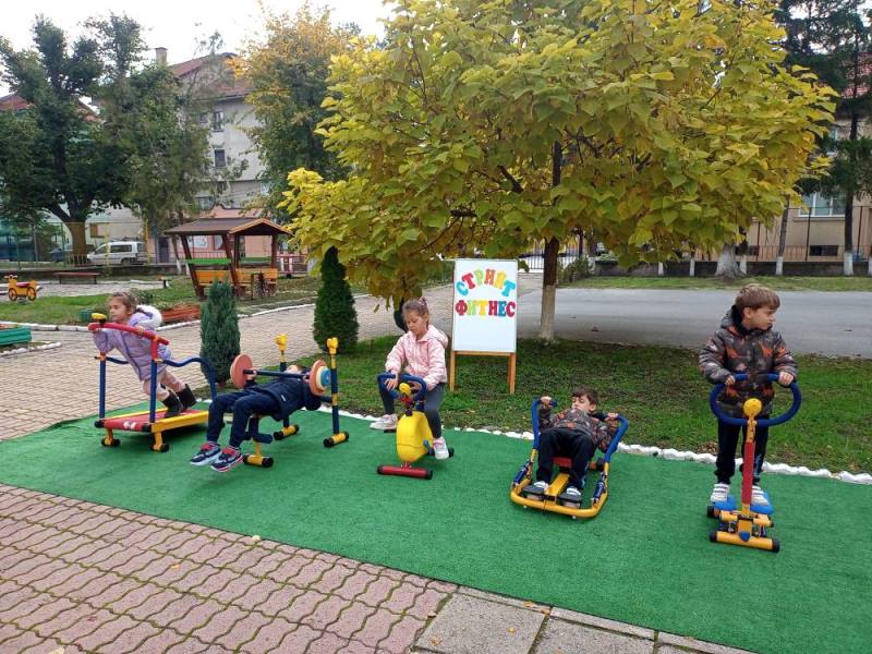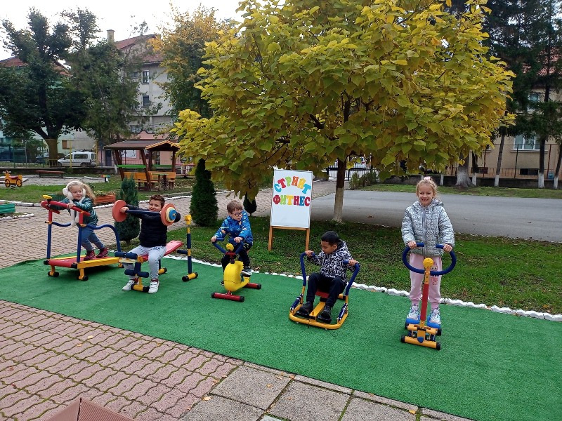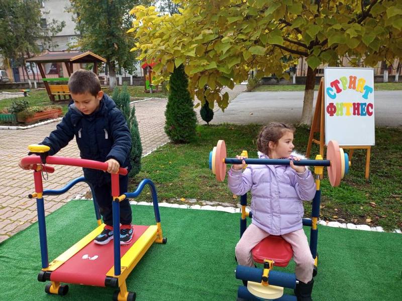 Децата от група "Кокиче" се забавляваха и спортуваха на открито, използвайки уредите за стрийт фитнес в двора на детската градина.