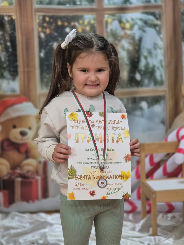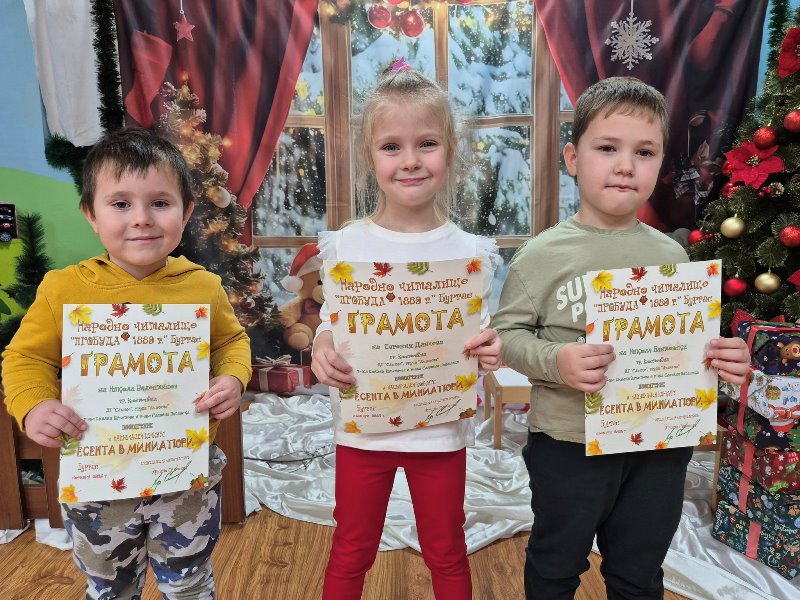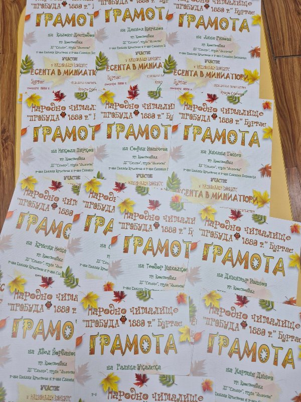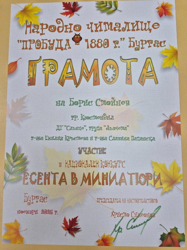 Децата от група "Лъвчета" участваха в Националния конкурс „Есента в миниатюри“, организиран от НЧ „Пробуда 1880 г.“Темата на конкурса бе ЕСЕНЕН БУКЕТ Задачата е участниците да създадат миниатюрно произведение - рисунка или графика, което да побере цялата красота и настроение на есента в съвсем малък формат.