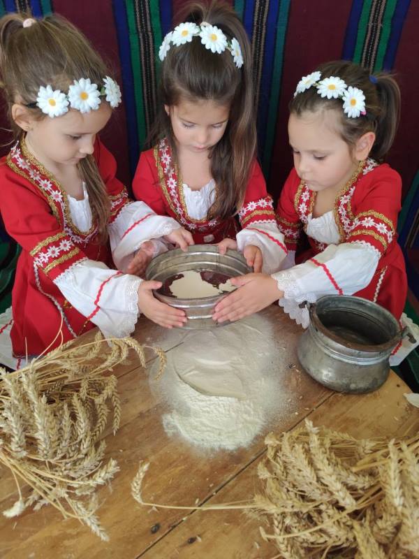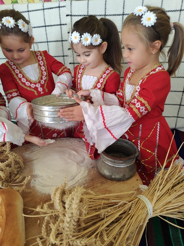 По интересен и увлекателен начин децата се запознаха с пътя на хляба – от зрънцето до питката и се включиха активно в замесването на меко тесто: пресяха брашно, ръсеха го с обич и запяха, както са правели нашите баби.