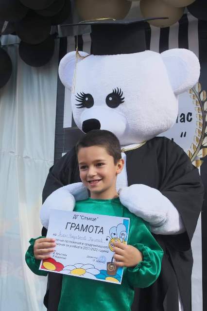 В края на тържеството, сред обсипаната с балони, грейнали лица и детски усмивки сцена се появи изненадващ гост – голямото бяло мече с черна тога и квадратна шапка с пискюл... То се включи в последния танц на децата и раздаде грамоти и подаръци на всички „пчелички“.