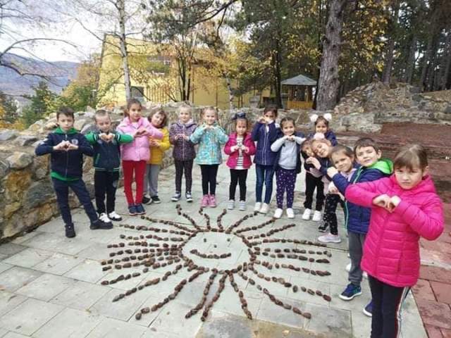 Разходиха се в гора от големи борови дървета, видяха дъба, кестена, шипковия и къпиновия храст. Интерес и вълнение предизвикаха долитащите звуци от птици и шумоленето от стъпките по сухите листа и съчки. Игрива катеричка с бързи подскоци и любопитен поглед от едно високо дърво прикова вниманието на децата. Развеселени, те се впуснаха във весели игри, танци и закачки. Подскоци, имитиращи катеричката, гоненица, събиране на шишарки, пръчици, камъчета и други природни материали бяха забавни занимания за децата. Неусетно се роди идеята със събраните шишарки да се изрисува голямо слънце, емблема на детската градина.