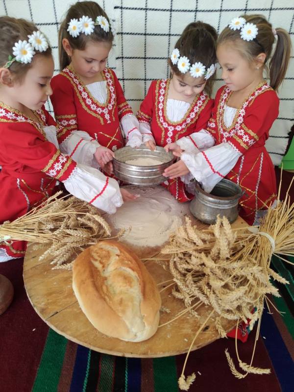 По интересен и увлекателен начин децата се запознаха с пътя на хляба – от зрънцето до питката и се включиха активно в замесването на меко тесто: пресяха брашно, ръсеха го с обич и запяха, както са правели нашите баби.