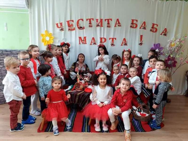 Баба Марта посети малчуганите пременена в красива народна носия и пълна кошница с мартенички. Децата се бяхa подготвили и я поздравиха с тематични песнички и стихчета, а тя в замяна на това и развеселена от топлото посрещане, закичи всички детски ръчички с мартенички, символ на здравето, чистотата и силата, и им пожела да бъдат здрави, бели и червени, весели и засмени, а след това почерпи с вкусна питка. Накрая добрата Баба Марта поведе и едно весело китно хорце в двора на детската градина, в което се включиха и малки и големи.