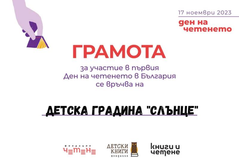 Децата от ДГ "Слънце" бяха отличени с грамота за активно участие в инициативата "Ден на четенето". Чрез организирането на различни дейности на малчуганите беше дадена възможността да осмислят огромното значение на книгите, които дават знания и мъдри съвети, предоставят уникалната си възможност на четящите хора да се докоснат до целия свят.